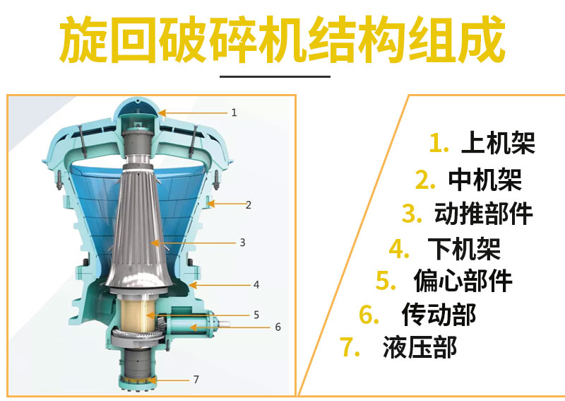 旋回式破碎機(jī)主要由橫梁部、上中下機(jī)架部、動(dòng)錐部、偏心套部、傳動(dòng)部和液壓缸部等組成.在設(shè)備工作時(shí),由電動(dòng)機(jī)帶動(dòng)水平軸旋轉(zhuǎn),水平軸通過(guò)齒輪帶動(dòng)偏心套旋轉(zhuǎn),再由偏心套帶動(dòng)動(dòng)錐部做圓周擺動(dòng),從而實(shí)現(xiàn)連續(xù)的擠壓破碎石塊??赏ㄟ^(guò)調(diào)節(jié)動(dòng)錐底部的液壓缸改變排礦口的大小,方便調(diào)整產(chǎn)品粒度;同時(shí)液壓缸也提供過(guò)鐵保護(hù)功能,當(dāng)有不能破碎的物體進(jìn)入破碎腔時(shí),液壓缸能自動(dòng)使動(dòng)錐下落釋放物體,保護(hù)破碎機(jī)。