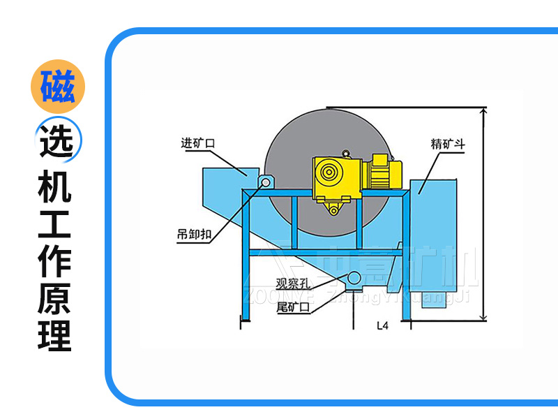 礦漿經(jīng)給礦箱流入槽體后,在給礦噴水管的水流作用下,礦粒呈松散狀態(tài)進(jìn)入槽體的給礦區(qū)。在磁場的作用,磁性礦粒發(fā)生磁聚而形成“磁團(tuán)”或“磁鏈”,“磁團(tuán)”或“磁鏈”在礦漿中受磁力作用,向磁極運(yùn)動,而被吸附在圓筒上。由于磁極的極性沿圓筒旋轉(zhuǎn)方向是交替排列的,并且在工作時固定不動,“磁團(tuán)”或“磁鏈”在隨圓筒旋轉(zhuǎn)時,由于磁極交替而產(chǎn)生磁攪拌現(xiàn)象,被夾雜在“磁團(tuán)”或“磁鏈”中的脈石等非磁性礦物在翻動中脫落下來,被吸在圓筒表面的“磁團(tuán)”或“磁蓮”即是精礦。精礦隨圓筒轉(zhuǎn)到磁系邊緣磁力較弱處,在卸礦水管噴出的沖洗水流作用下被卸到精礦槽中,如果是全磁磁輥,卸礦是用刷輥進(jìn)行的。非磁性或弱磁性礦物被留在礦漿中隨礦漿排出槽外,即是尾礦。